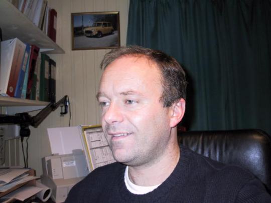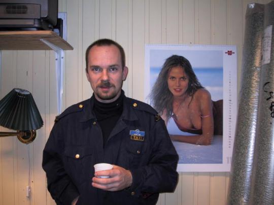 Her er Einar. Han var med og starta opp Askvoll Motor AS i 1989. Den gang som no treng vi litt "moralsk støtte" i kvardagen - den heng på veggen bak Einar som du ser :O)